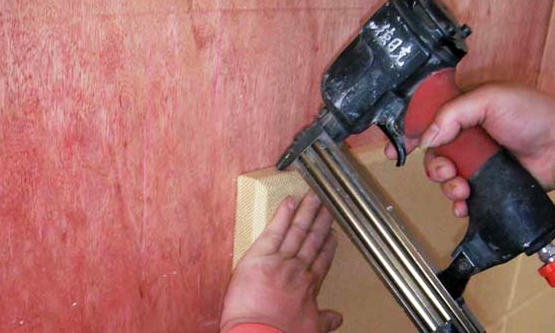 貼幾個(gè)點(diǎn),將板平貼在石膏板上,用打釘器將釘固定在吸音板開(kāi)榫處,吸聲板之間用插